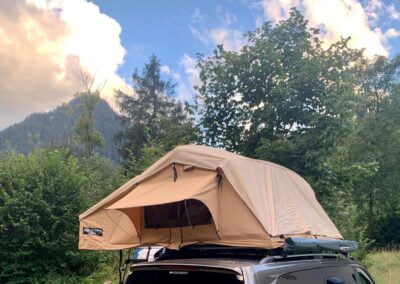 De daktent voor 4 personen en ideaal voor families. Deze 400 grams katoenen daktent kenmerkt zich door twee ladders en een ruime luifel boven de twee ingangen. Hierdoor bestaat de mogelijkheid om aan de onderzijde van de daktent een ondertent te ritsen.