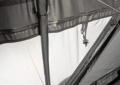 De speciaal ontworpen ritsen van de ROOF SPACE 2 maken geen geluid bij beweging in de wind, zodat je in natuurlijke rust kunt slapen. De voorgeïnstalleerde stokhoezen dempen de aluminium stokken in het interieur en zorgen voor een aangenaam ruimtegevoel, maar kunnen indien nodig snel worden verwijderd met eenvoudige klittenbandsluitingen. De stabiele klittenbandstand op alle zijden, beschermd door een muskietennet en eenvoudig af te sluiten, zorgt voor optimale luchtcirculatie en ventilatie in de tent.