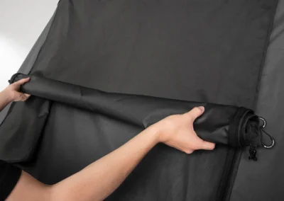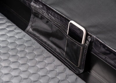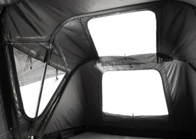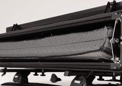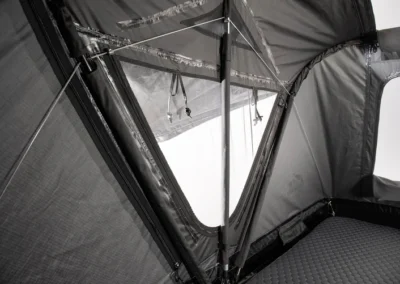 De robuuste en gebruiksvriendelijke drukknopen maken eenvoudige montage en demontage mogelijk, zelfs op grote auto’s. Ze dienen ook als houders voor accessoires zoals schoentassen. Dankzij de stabiele en flexibele knopen bij alle openingen van de ROOF SPACE 2 kunnen ramen en deuren naar wens worden opgerold en vastgezet. Er is 4,5 cm extra ruimte in de koffer, wat het mogelijk maakt om je slaapzak en kussen in de koffer te laten bij het inpakken, zodat je snel en gemakkelijk kunt vertrekken. Voor de ROOF SPACE 2 gebruiken we een polyester ripstop-stof van de hoogste kwaliteit met 320 g/m² en een waterkolom van 3000 mm, terwijl het tegelijkertijd zeer ademend is.