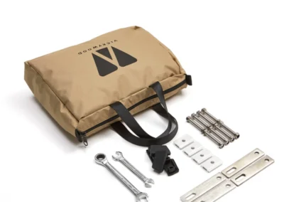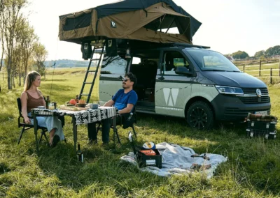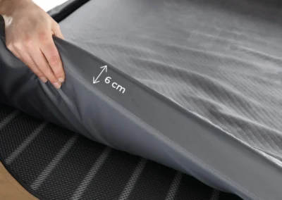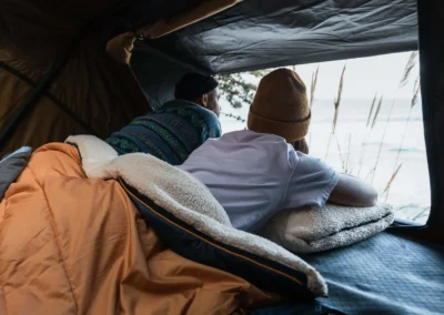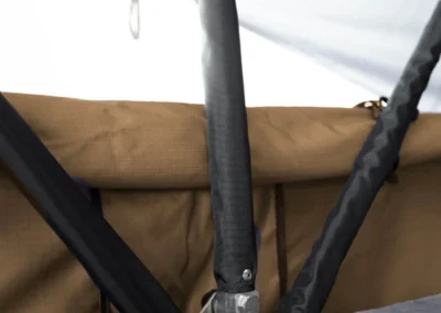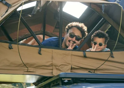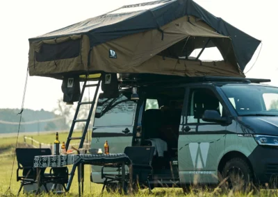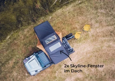 Boven wacht je een gevoel van ruimte en een prachtig uitzicht. De daktent is voorzien van drie zijramen die je kunt openen en sluiten, en ze zijn uitgerust met flexibele muskietennetten. Bijzondere hoogtepunten zijn de twee grote skylineramen in het dak, waardoor je ’s nachts de sterrenhemel kan bekijken. Erg handig is ook de LED-binnenverlichting, die je eenvoudig kunt inschakelen via een USB-poort op een powerbank. Als je horizontaal ligt, zul je merken dat het visco matras met hoge dichtheid zorgt voor optimaal ligcomfort, ruim genoeg voor drie personen en minstens zo comfortabel als thuis.