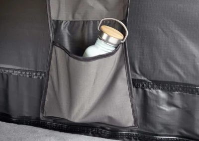 De verstelbare telescopische ladder brengt je gemakkelijk naar binnen. Twee schoenenzakken naast de ingang zorgen dat de leefruimte netjes blijft. Het interieur oogt open en licht dankzij de ramen aan beide zijden, waardoor je altijd verbonden bent met je omgeving.