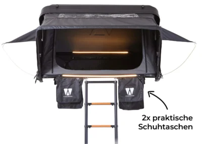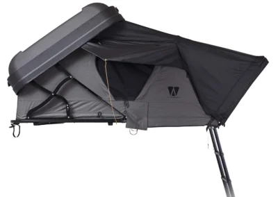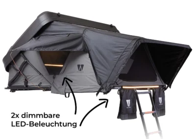 Dankzij de lichte aluminium constructie, STABILUS-gasveren en sfeervolle LED-verlichting is de grijze Mighty Oak 160 een robuuste daktent die klaar is voor elk avontuur.