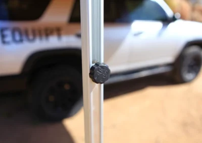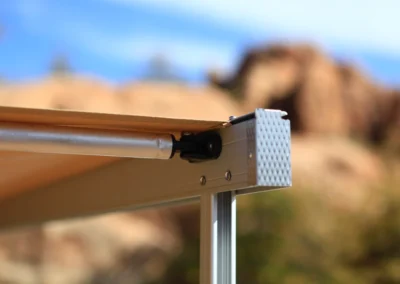 De Eezi-Awn Swift is een vrijstaande luifel, ontworpen met geanodiseerde aluminium spanarmen die de structuur stevig ondersteunen. Voor extra stabiliteit bij winderige omstandigheden wordt het gebruik van de meegeleverde verstelbare poten aanbevolen.