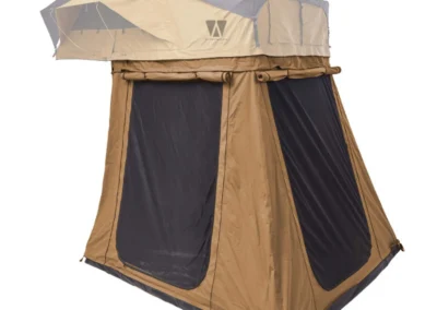 De ondertent voor de Vickywood BIG WILLOW voegt veelzijdigheid toe aan uw daktent door een overdekte entree te bieden. Het past op bijna elke auto met normale hoogte dankzij het slimme ritssluitingsysteem waarmee de hoogte kan worden aangepast (210 – 220 cm). Met deze luifel kunt u uw Vickywood BIG WILLOW uitbreiden met extra opbergruimte, extra slaapplaatsen of een beschermde loungehoek.