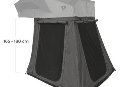 De ondertent voor de Vickywood BIG WILLOW voegt veelzijdigheid toe aan uw daktent door een overdekte entree te bieden. Het past op bijna elke auto met normale hoogte dankzij het slimme ritssluitingsysteem waarmee de hoogte kan worden aangepast (165 – 180 cm). Met deze luifel kunt u uw Vickywood BIG WILLOW uitbreiden met extra opbergruimte, extra slaapplaatsen of een beschermde loungehoek.