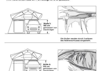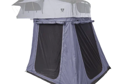 Met een hoogte van ca. 1,8 meter kun je de ondertent comfortabel gebruiken. Dankzij de ingangen aan beide zijden van het voertuig heb je altijd gemakkelijk toegang tot je spullen, terwijl je beschut blijft tegen wind en regen. De stevige vloer is voorzien van een ritssluiting en kan indien gewenst worden verwijderd.