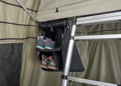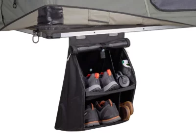 Houd de binnenkant van uw tent schoon en droog door schoenen en laarzen buiten de tent te hangen. Met vier verschillende opbergvakken is de Thule Rooftop Tent Organizer verdeeld in twee grote opbergvakken voor laarzen of schoenen en twee kleinere vakken voor kampeerspullen. Het bevat twee gaasvakken om kleinere items in op te bergen.
