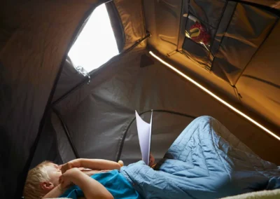 Een belangrijk comfortelement van de Vickywood CUMARU EASE 135 is het geïntegreerde luchtmatras van ongeveer zes centimeter dik, voorzien van een 3D mesh laag voor betere ventilatie. Het matras vormt zich naar het lichaam en kan met de meegeleverde compacte pomp binnen enkele seconden worden opgeblazen. Hierdoor combineert deze aluminium daktent een laag totaalgewicht met hoog slaapcomfort. In combinatie met hoogwaardige tentstof en een doordacht ventilatiesysteem ontstaat een aangenaam slaapklimaat, zelfs tijdens langere reizen of wisselende temperaturen.